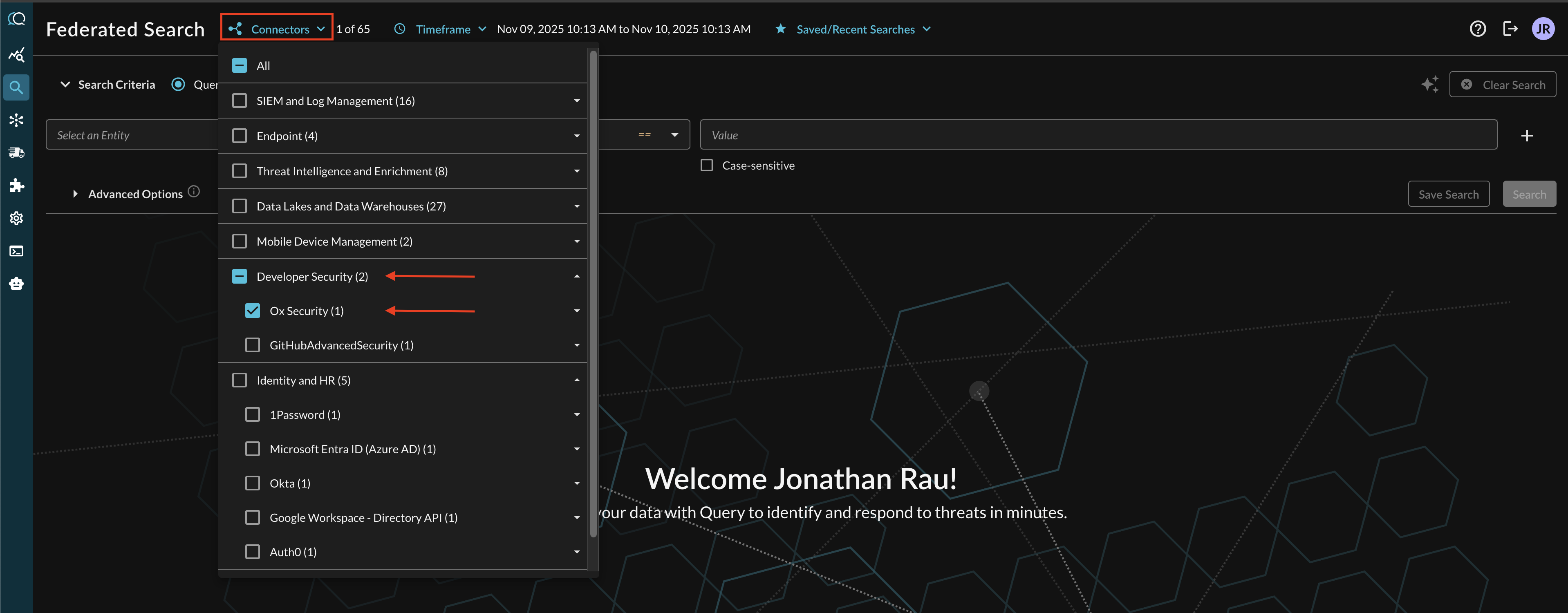 You will now see Ox Security added as an available Connector within the Query Search and Query Summary Insights UI.