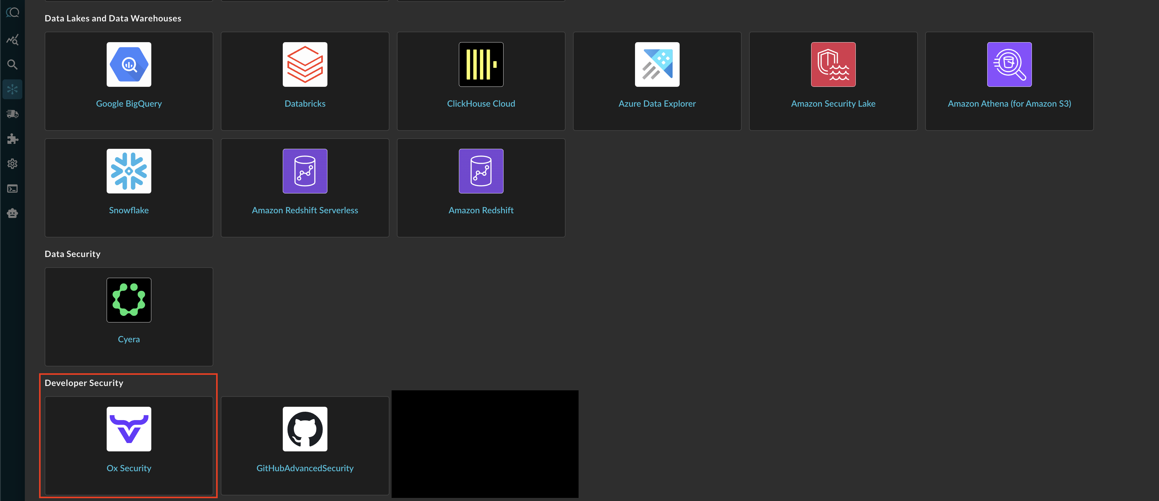 Developer Securitycategory as shown below (FIG. 2). You can also search for Ox Security using the search bar in the Add Connector page.