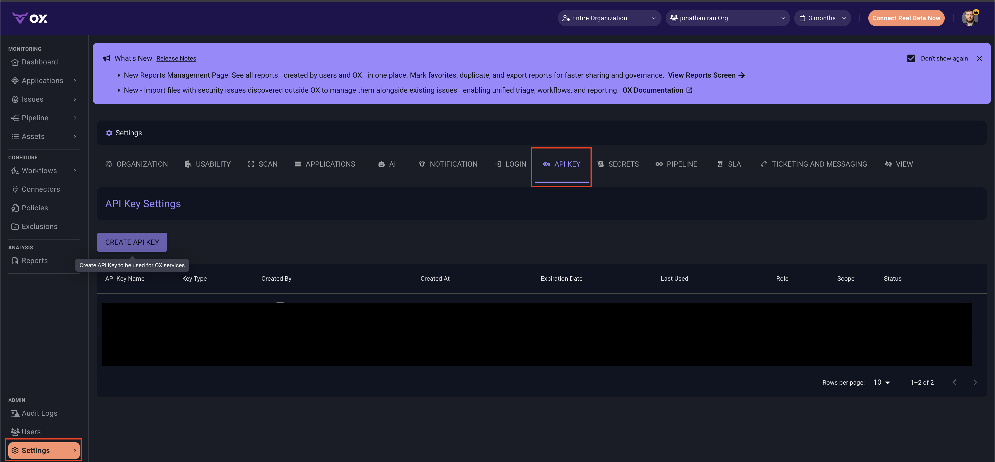 In the OX Security Console, select Settings on the bottom-right hand side of the screen and navigate to the API Key tab as shown below (FIG. 1).